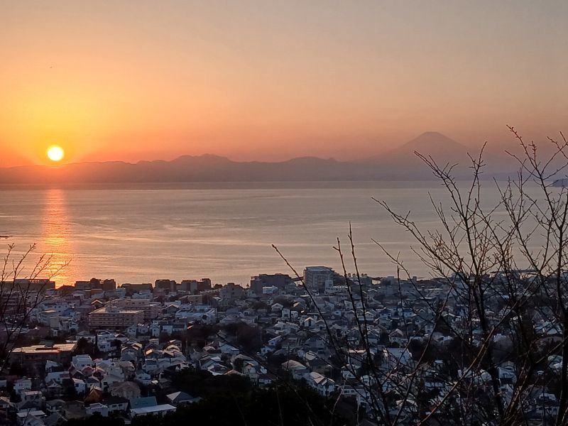 終点の仙元山からは、写真の通り、相模湾・伊豆半島に沈む綺麗な夕日を眺める事が出来ました。疲れても楽しい一日でした。