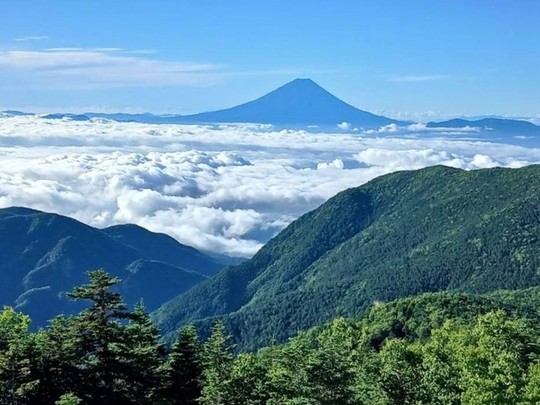 上の写真は午前4時半頃の太陽が雲に遮られてますが朝日が昇る時の山小屋近くからの写真で、下の写真は薬師岳に行く途中の富士山の写真です。雲海が素晴らしかったです。