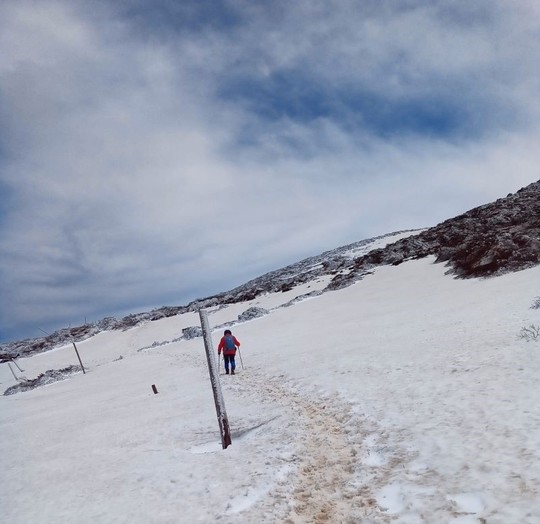 連休中、蔵王・熊野岳に登りました。4日は視界も悪く風速20m/s故にモスキート級の連れ合いが吹き飛ばされそうで途中下山、再度挑戦の5日は風速10m/s程度なので行ける所までと言う事で登り始めました。頂上まで行けたのは良いのですが、蔵王・御釡の湖面はエメラルドグリーンではなく、前日の雪で白濁になっておりました。