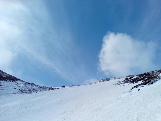 雪の那須岳を歩きました。登山口に在る山の神様の鳥居が頭を残して雪に埋まっておりました。アイゼンを履いての登山で凍った個所でも安全に登れました。頂上から下る途中の昼頃より雪が降り始めましたが、登山中は風も雨もなく快晴で絶好の日よりでした。