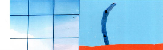 右下図:外部(観客)からは水槽内部を除けるが、内部(魚)からは観客を見る事が出来ないようにマジックフィルムが水槽の前面ガラスに貼付:オフィスビルの窓ガラスに貼付のマジックフィルムとは裏表を反対に貼付:登録第1484522号
